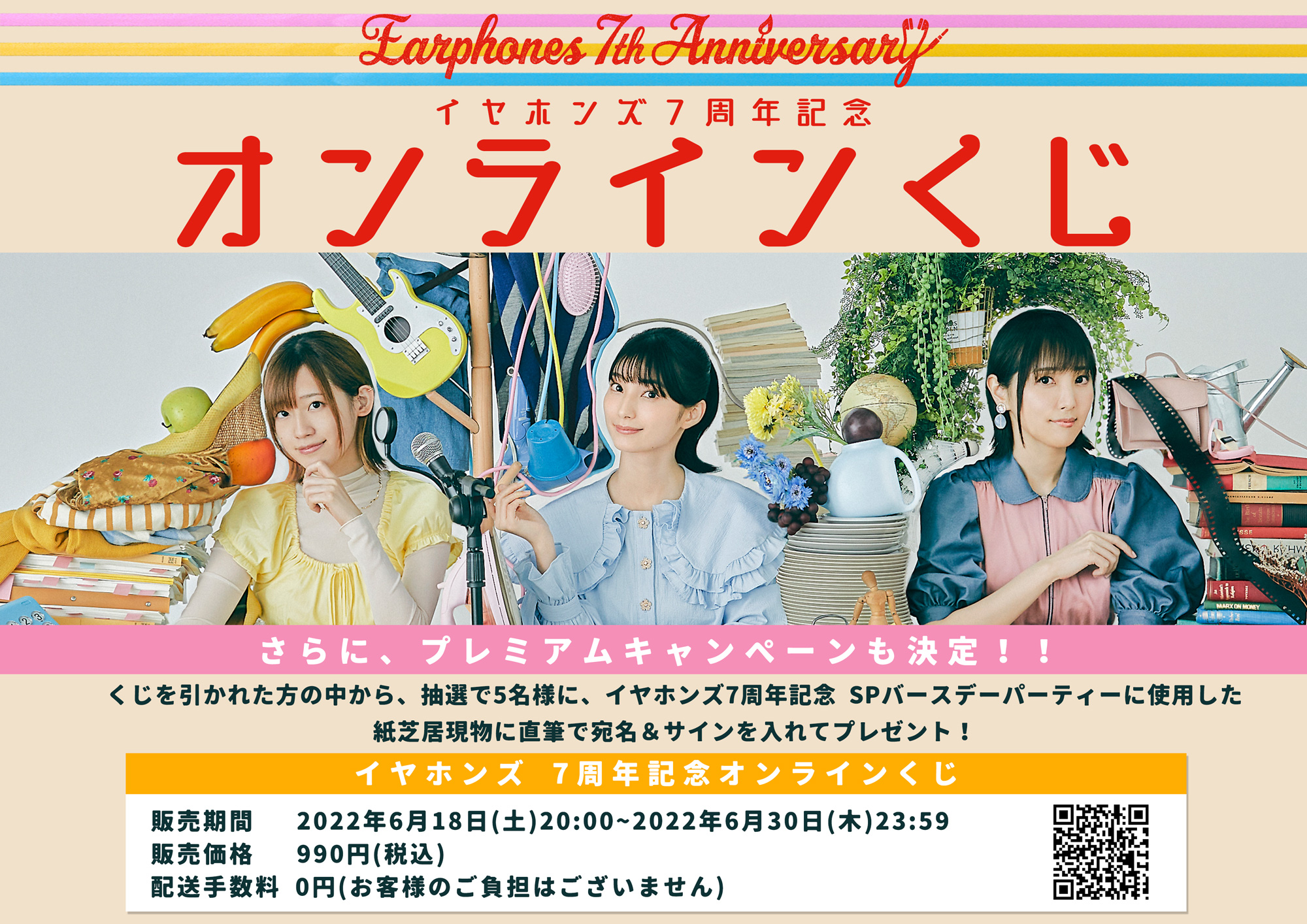 高野麻里佳、高橋李依、長久友紀の3人からなる声優ユニット・イヤホンズの結成7周年を記念して、オンラインくじと7周年グッズの販売がスタートした。