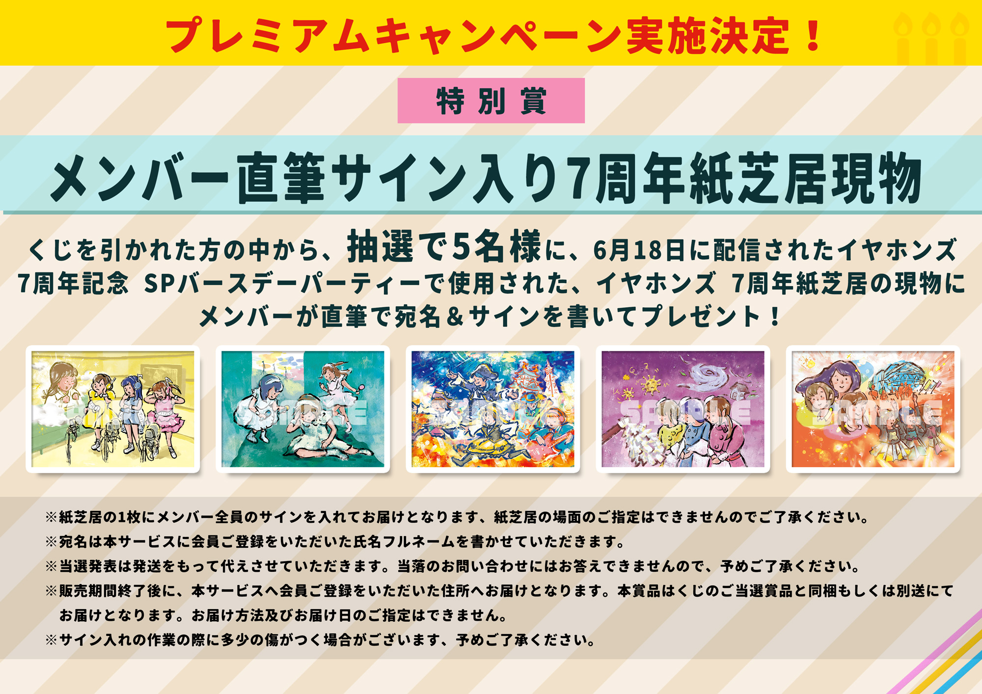 くじを引かれた方の中から、抽選で5名様に、6月18日(土)に配信された「イヤホンズ7周年記念SPバースデーパーティー」で披露された、イヤホンズ7周年紙芝居の現物にメンバーが直筆で宛名&サインを書いてプレゼント!