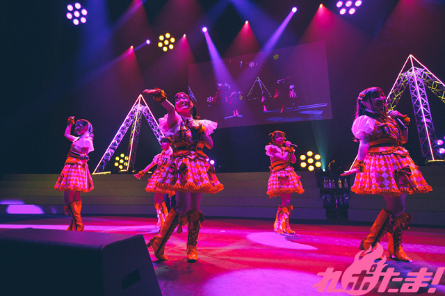 入れ替わるように登場したのは月のテンペスト。こちらはキレのあるダンスで客席を魅了。「月下儚美」、さらに「この季節に歌うのは初めて」という「恋と花火」と続けた。MCでは橘さんが「ゲーム配信1周年、みなさんのおかげでここまできました。ありがとうございます!」とオーディエンスに感謝の気持ちを伝え、最後はスカートをひるがえしながら「The One and Only」を歌い上げた。