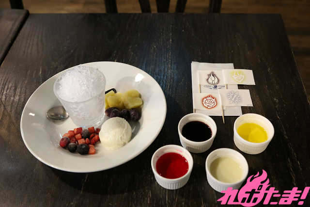 チームRWBY のカラーをイメージし、ひんやりしたフルーツやアイスで飾ったかき氷。