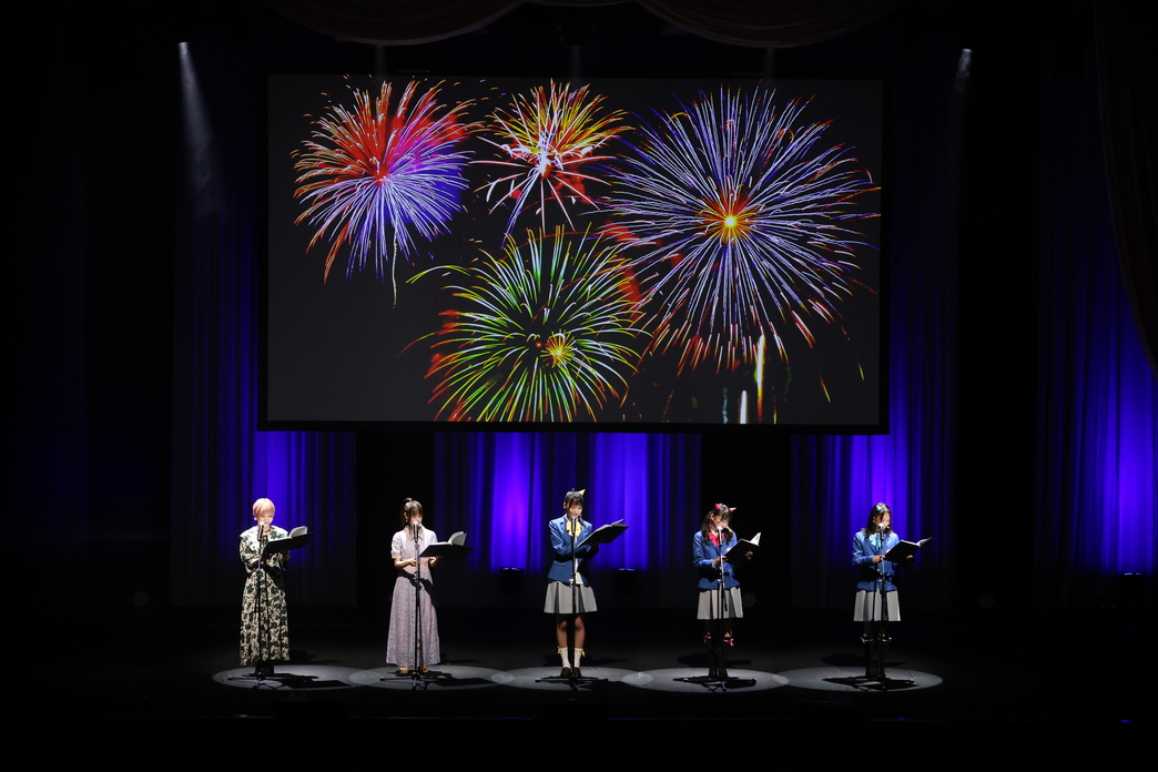 続いては朗読劇「御蓮田町の夏祭り」。町内で行なわれている夏祭りにやってきたおにっ子や桃、法子たちの様子が生朗読で披露された。輪投げや射的、金魚すくいに興じるなか、いつの間にか姿を消してしまった法子の代わりに登場したのは、人気アイドルの“のりりん”! 大ヒット曲「ときめき♡ワンダーランド」を歌唱し、客席にはピンク色のサイリウムの花が咲いた。間奏では、のりりん応援隊(ファン)から募集した「コール&レスポンス」のボイスも入り、会場はライブステージさながらの熱気に包まれた。