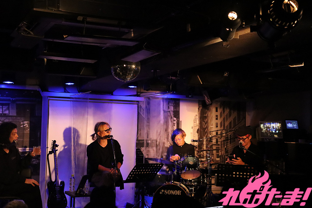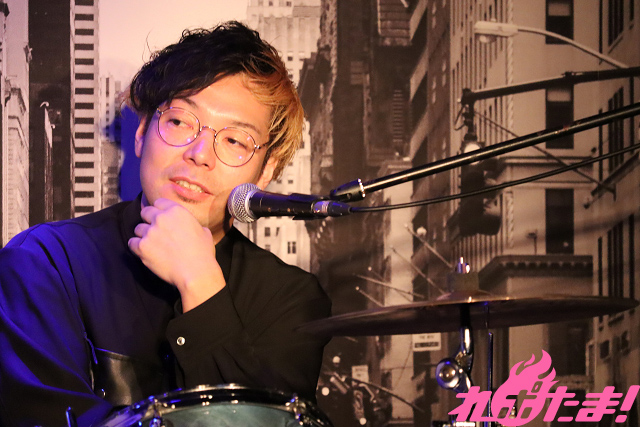 客席と一緒に乾杯したあとは、さっそく楽曲作りがスタート。ベースの鳥男さんから「スタジアムロックっぽいもので」、エンドウ.さんからは「(この日は不参加のボーカル)キリンちゃんが歌えるように、女性ボーカルに対応できるような曲で」という提案があり、楽曲の方向性が決定!