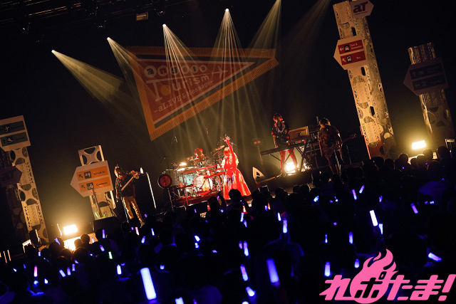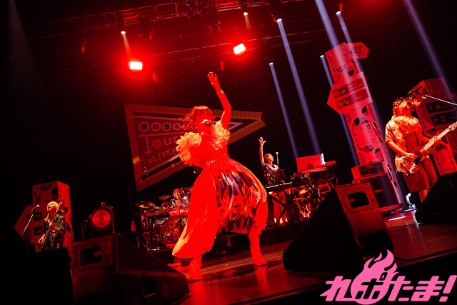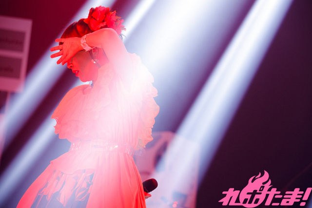 遠藤さんが退場すると、会場に確かな余韻を残しながら、真っ赤に染まったステージで「連撃Victory」を投下。曲間ではatsukoさんが客席に向けて指鉄砲を撃つ仕草を見せ、大いに盛り上がった。続いては「虚無の嵐」。フルコーラスで歌うのは、今回のツアーが初めてとのこと。センターでしっとりと歌い上げた。