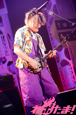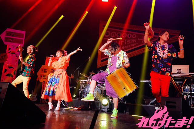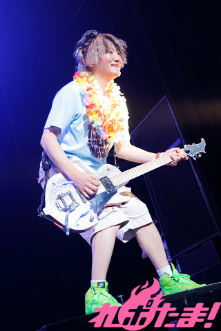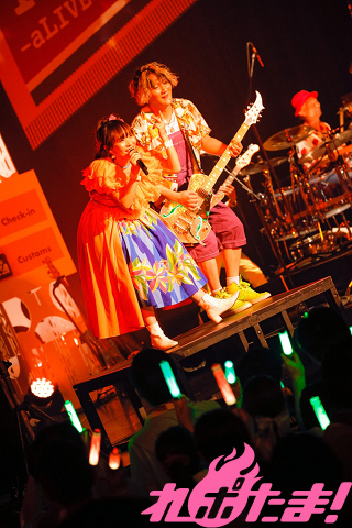中盤戦に突入すると、まずはカスタネットが大活躍する「アロハTraveling」を披露。世界中を旅しているような気分になれるナンバーを、カスタネットの音で彩った。続いて黄色いペンライトの海が広がるなか、KATSUさんがスルド(ブラジルの打楽器)に持ち替えて「全力☆Summer!」を披露した。