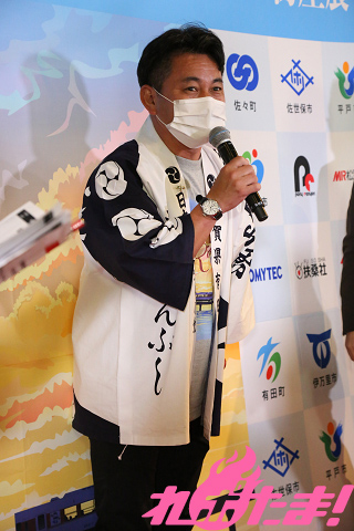 安齋さんと南田氏がゲストを呼び込む形式で行なわれた今回のイベント。まず登場したのは松浦鉄道の今里社長。西浦ありさとして車内アナウンスを担当したという安齋さんは「初めて聞く地名が多く、ちょっと大変でしたが、施設名を覚えるきっかけにもなりました。桜のきれいな駅が印象的です」とコメント。今里社長は「たびら平戸口駅前には鉄道博物館があるので、ぜひ遊びにきてください!」とPRしていた。