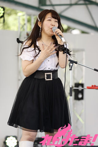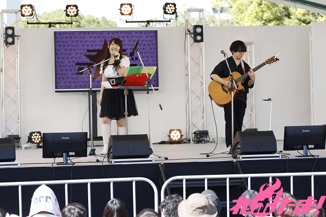 晴天に恵まれ、絶好のライブ日和となったこの日。太陽に感謝しながら足でリズムを取りつつ「さくらさくら咲く~あの日君を待つ 空と同じで~」を披露すると、続くMCでは『ひだまりスケッチ』のアフレコ現場に行ったときの思い出を語る2人。「声優さんの演技や技術に感動しました!」と目を輝かせていた。