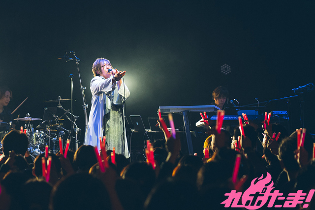ここからも大事なナンバーが続く。「この人がいなければ歌手活動を続けていたかわからない」というランティスの井上俊次社長(当時)と共作した「silver rain」のピアノバージョンを披露。そして、クラップが響くなか「花」、客席を指さしながら「ハッピーの誕生」「My dream=My will.」と続けた。