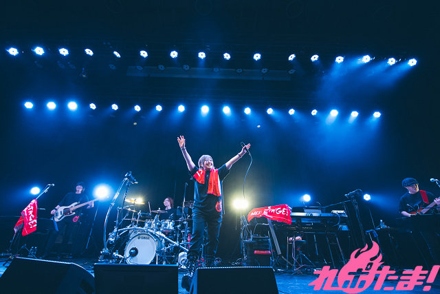 温かい拍手に包まれるなか、ふたたびMCへ。「30代ではいろいろありました。いろいろあると、『痛ロック』な曲を作ってしまうんですよね」と苦笑いすると「痛ロック」の最たる楽曲「砂の城」、さらに赤い光に照らされて「悪魔のkiss」「hit man」「鏡の国のアリス」と続けた。