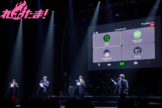 最初の朗読劇では、3つの年代に生きる4人がリモートでトーク。ダルがVTuberになったり、一番先の年代を生きているポロンからARカフェなどの最新技術を聞いたダルとフラウが興奮し、紅莉栖がツッコミを入れるなど終始楽しいやり取りが行なわれた。