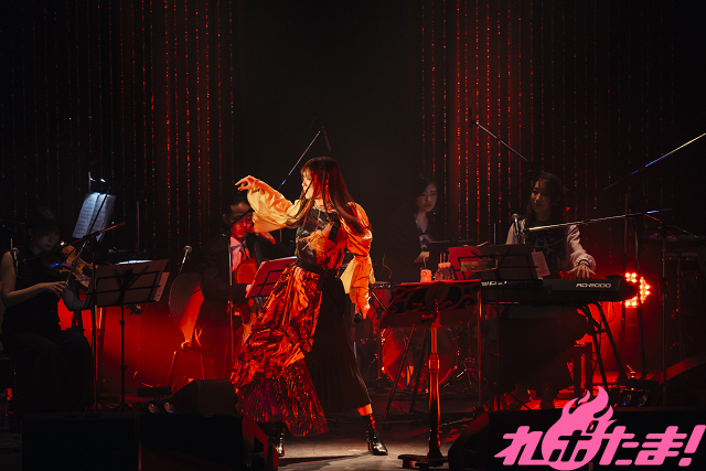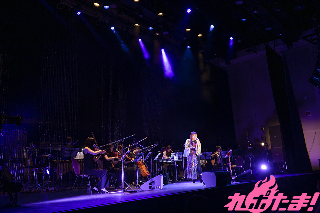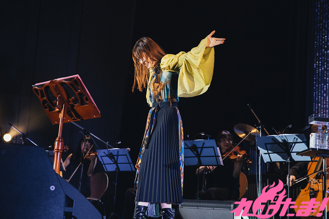 間奏のフルートが印象的な「真聖輝(ひかり)のメタモルフォシス」、さらに「THERE IS A REASON」をまっすぐ前を見つめながら歌い上げ、MCでは「オーケストラ編成のコンサートはかねてからの夢だったので、今日を楽しみにしていました。みなさんもそれぞれの楽しみ方をしてください!」と笑顔で語った。さらに、軽やかなリズムを刻みながら「オラシオン」、壮大なイントロに乗せて「TEARS BRAKER with violin」と披露していった。