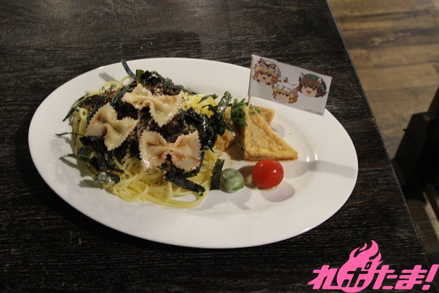赤いねり梅で和えたファルファッレと、真っ黒のもみ海苔を散らして、紫のリボンとスキマを表現! 藍の耳のような三角の厚揚げ、橙の服装をイメージしたソラマメとミニトマトもご一緒に。