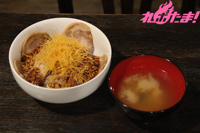 豚肉に食べるラー油をかけた刺激的な味。真ん中には爆裂をイメージしサクサクした食感の黄色いカダイフを。お味噌汁もセットです♪