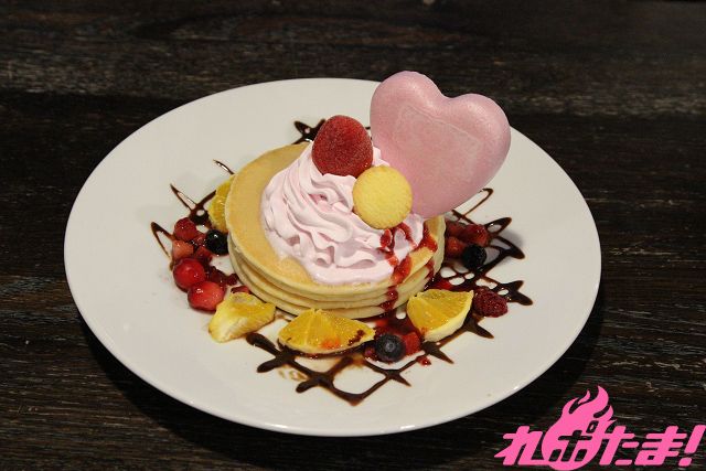 三段重ねのふわふわパンケーキ。丸いクッキーとリボンのようにをかけた赤いフランボワーズソースでゆんゆんの髪飾りを表現。