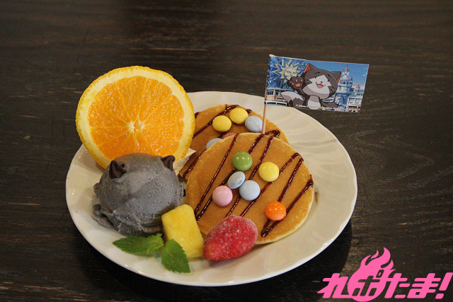 チョコソースとカラフルなチョコレートで飾られたパンケーキの丘とフルーツの向こうに見えるのはみっしぃの後ろ姿!?