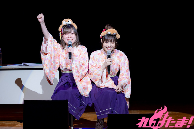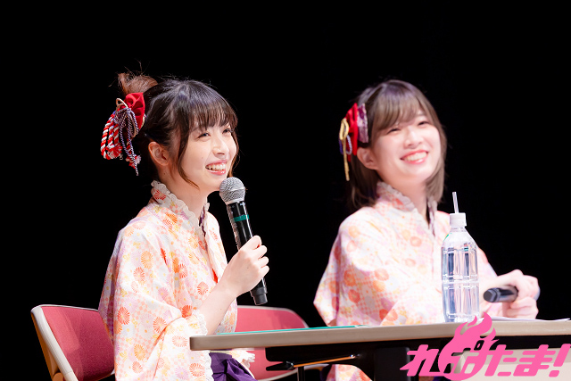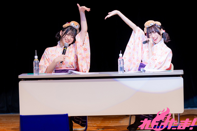青山さんは「この袴を着てのイベント(「温泉むすめ」のイベント)は4年ぶりですね……」と感慨深い様子。また、進藤さんが演じる庵は今年2月に誕生したばかりの温泉むすめということで「みなさん、はじめまして~!」と初々しいあいさつを見せていた。
