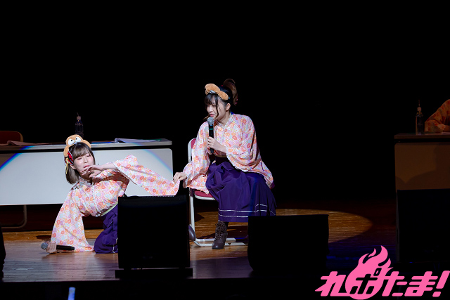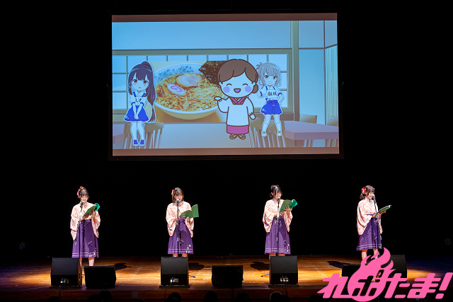 続いて「温泉むすめ スペシャル朗読劇!」コーナー。各々が演じている温泉むすめについての紹介のあと、朗読劇がスタート! 「1部」のタイトルは「ドキドキ温むすウォッチング」。庵と葉凪が飯坂温泉の、とある食堂で昼食をとる様子を真尋と青井が陰からウォッチング。その言動にツッコミを入れる……というもの。