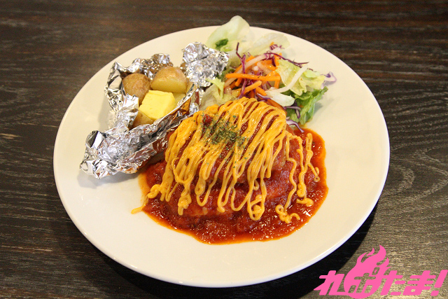 [じゃがいも+バター+ハンバーグ+トマトソース+チーズソース ごはん+ミックスサラダ]