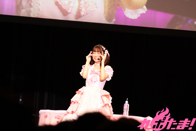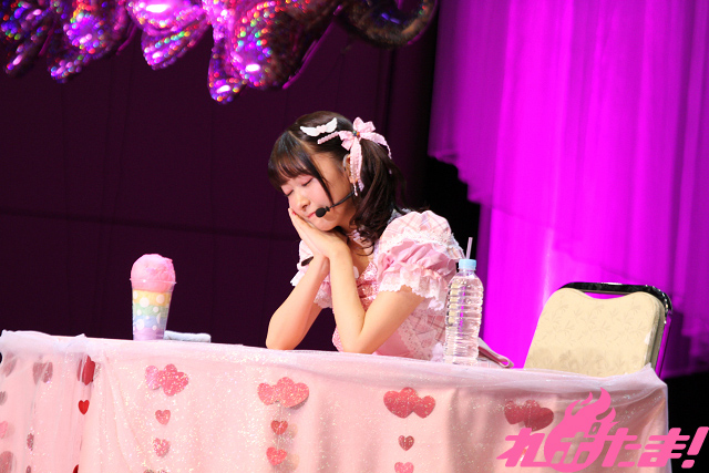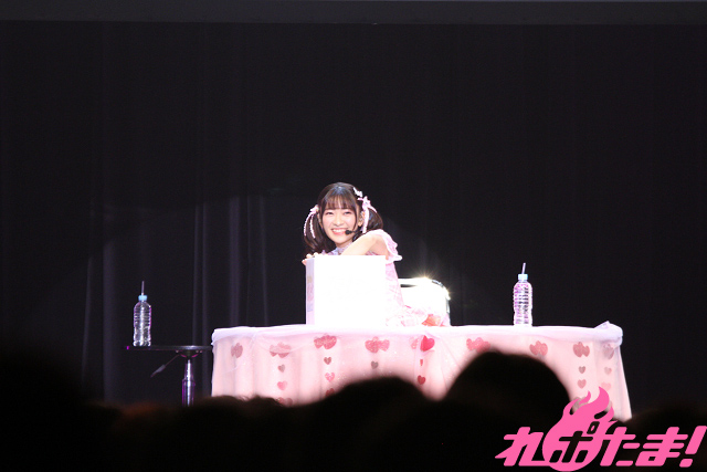 指でハートマークを作りながら「君のこと、大好きだよ」、ツインテールを持ち上げながら「すぐ泣いちゃってごめんね」と「胸キュンゼリフ」を披露したり、時間内に思いつく限りの「カワイイポーズ」で客席を魅了したり、わたあめをカワイく食べてみたり、鈴原さんによる「カワイイ世界」が場内に広がっていった。