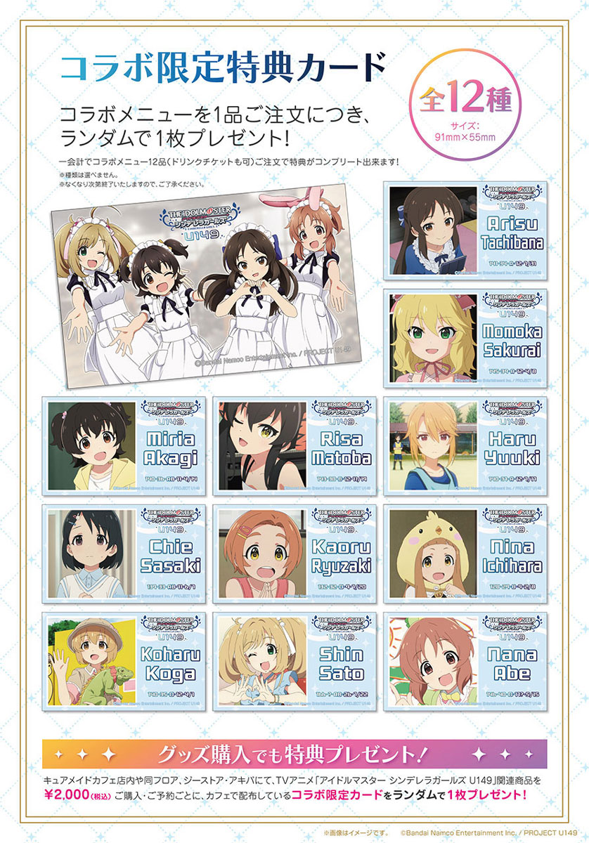 CURE MAID CAFÉ(キュアメイドカフェ)店内や、同フロアのジーストア・アキバにてTVアニメ「アイドルマスター シンデレラガールズ U149」関連商品を2,000円(税込)ご購入・ご予約ごとに、カフェで配布している<コラボ限定カード(全12種)>をランダムで1枚お渡しします。