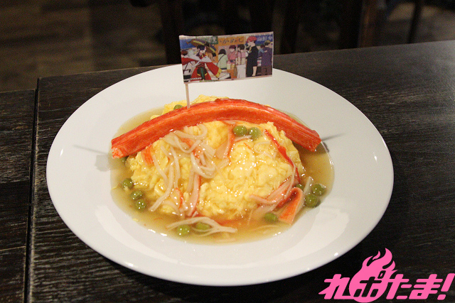 ガウマとひめの再会のあのカニをイメージして、カニカマで中華あんかけをつくりました。白いご飯にとろっと卵を乗せ、ほぐしたカニカマとグリーンピースが入ったカニ風味の中華あんをかけました。しっかりとカニの風味がする1品です。