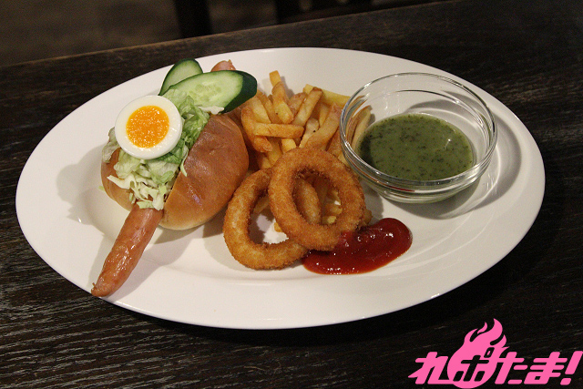お馴染みスペシャルドッグはケチャップとマスタード入り。裕太と六花が2人で食べたドーナツをオニオンリングでイメージ。蓬と夢芽はヘアピンをイメージしたフライドポテトで表現。バジルソースを付けてヘアピン色にしてくださいね。