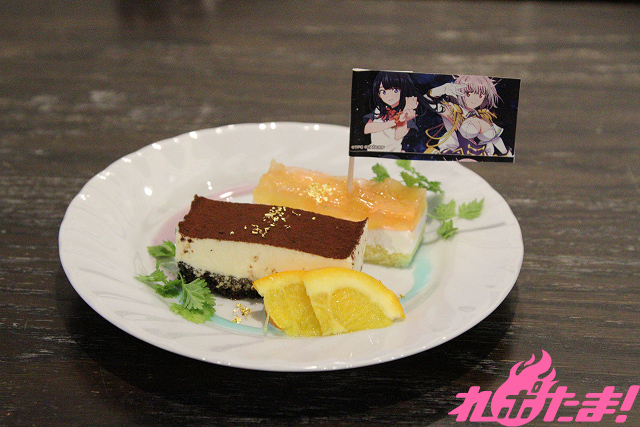 六花とアカネのふたりをイメージした2色のケーキプレート。2色のソースで囲みキラキラの金箔をかけました。濃厚系とさっぱり系の2種類のケーキでふたりの友情を味わってください。