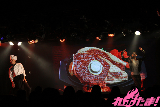 「我こそはステージ上で接客を受けたい」と次々名乗りがあげられたなか、選ばれた幸運な1名(この日はお子さん)の前には「お姫様スタイル」「ステーキ」と「ショコラケーキ」が用意され、楽しいダンスとともに行なわれたおもてなしに満面の笑顔を浮かべていた。