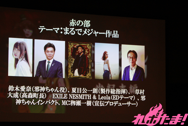 「赤の部」には宣伝プロデューサーの栁瀬一樹氏が司会のもと、邪神ちゃん役・鈴木愛奈さん、EDテーマ「ただいま feat. EXILE NESMITH」を歌唱するNESMITHさん(EXILE)とLeolaさん、製作総指揮・夏目公一朗氏、熊本県高森町長・草村大成氏、邪神ちゃんインパクトが登壇した。