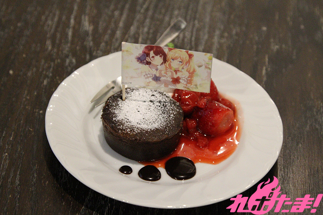 中からとろっとチョコレートがとろけます。チョコソースでレイを、赤いイチゴ入りのソースでクレア様を表現しました。