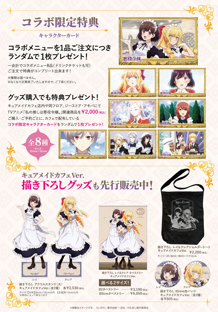 CURE MAID CAFÉ(キュアメイドカフェ)店内や、同フロア、ジーストア・アキバにて『TVアニメ「私の推しは悪役令嬢。」』関連商品を2,000円(税込)ご購入・ご予約ごとに、カフェで配布しているコラボ限定カードをランダムで1枚お渡しします。コラボカフェと合わせてご利用ください。