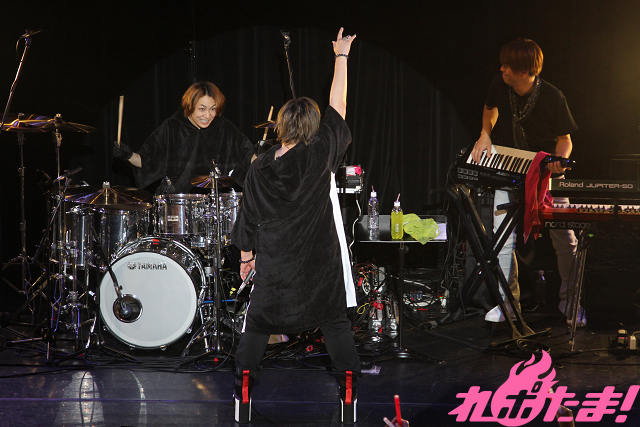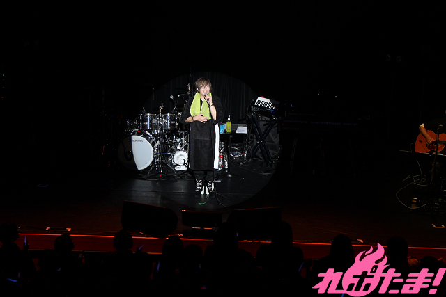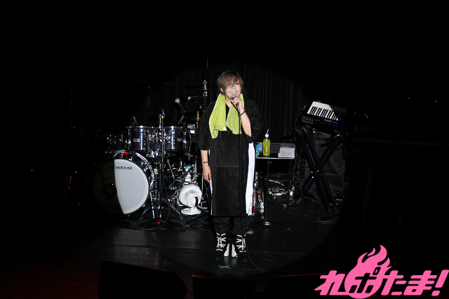 メンバーがそろったあとのMCでは近況トークを展開。最近出演した朗読劇で濃い人生を演じたそうで「死ぬまでにどう生きるか?」と真剣に考えるようになったとのこと。オーディエンスに「生きているうちに楽しもうぜ!」と叫ぶと、バンドメンバーを呼び込み、ライブグッズの紹介が行なわれた。スタッフのアイデアも借りてサウナ関連の商品を多く作ったそうで、「とくに女子チームで考案したポンチョがお気に入りです!」と笑顔で話していた。