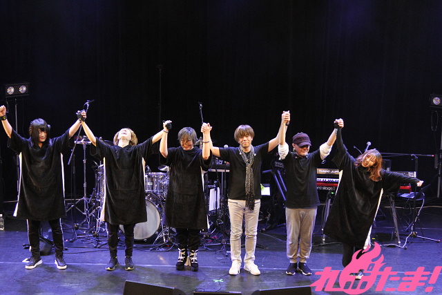 2人に続いて登場した目木とーるさん(ギター)、Tabokunさん(ベース)、青山英樹さん(ドラム)は緒方さんから「ラフな格好で」とリクエストされていたこともあり、リラックスした衣装で登場。ちなみに岩瀬さんはパッと見が上半身裸に見えるTシャツを着用し、会場を盛り上げた。
