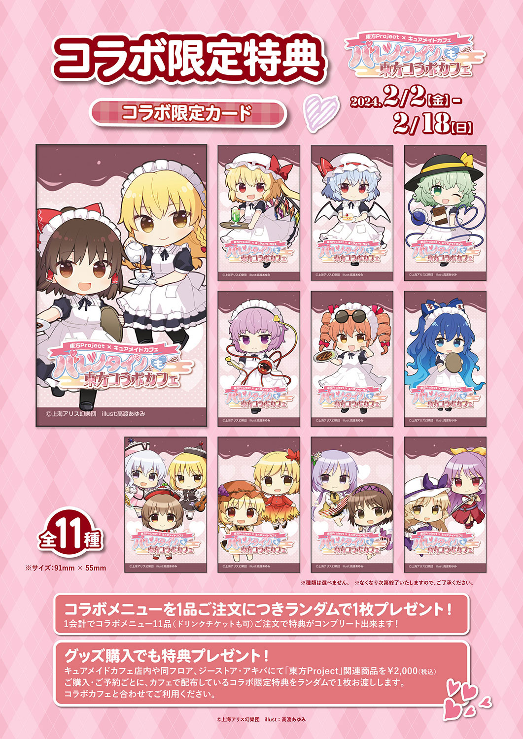 CURE MAID CAFÉ[キュアメイドカフェ]店内や同フロア、ジーストア・アキバにて『東方Project』関連商品を2,000円(税込)ご購入・ご予約ごとに、カフェで配布している<コラボ限定カード(全11種)>をランダムで1枚お渡しします。