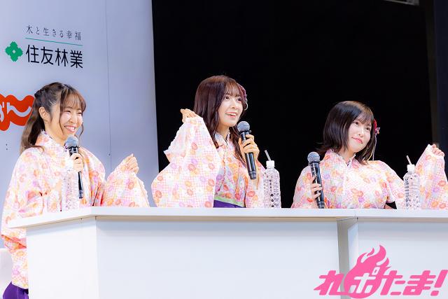 鈴原さんと鶴見さんは『温泉むすめ』関連のステージは初めてとのこと。衣装に袖を通した感想について、鈴原さんは「前から『カワイイ衣装だな』と思っていたので、こうして着ることができて感激です!」、鶴見さんは「以前に少しだけ着たことがあるのですが、ぽか旦那、ぽか女将の前で着ることができてうれしいです。同時に、背筋が伸びる思いです」とそれぞれ感想を語った。