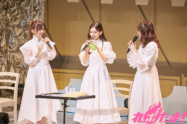 「ペンケース」の色が緑色であることに触れ、「私たちの大事な先輩・浅野真澄さんが所属していたユニット・Aice⁵での担当カラーが使われていてうれしい!」と興奮気味の3人。