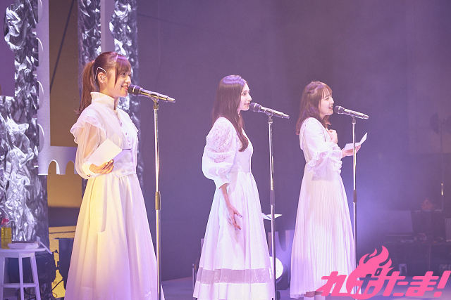 ユニットカラーである白い衣装に身を包んだ3人。まずは「在りし日」と「ミンナゲンキカ。」を披露。スタンドマイクの前で“手紙”を手に、ムードたっぷりに歌い上げた。
