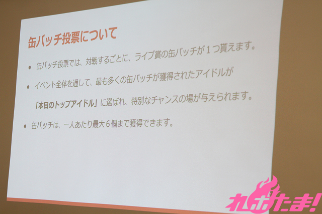 缶バッチは「イベント内人気投票」にも使われ、最終的に一番人気のあるアイドルの缶バッチを多く持っていた1名もトーナメント優勝者と同じく表彰される、というルールとなっていた。