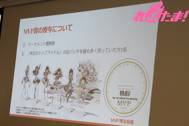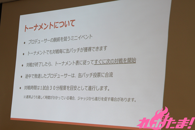 本イベントのメインは参加者全員による「トーナメント戦」で、優勝するとアイドルの特大アクリルスタンドおよび「MVP(Most Valuable Producer)特注台座」が贈られる。