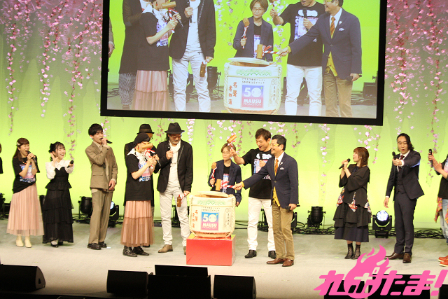 まずは長谷川たか子社長から来場者にむけてあいさつが行なわれた。「25年前(創業25周年)は日比谷公会堂でイベントを行ないました。今回もみなさんと一緒に祝うことができてうれしいです」と感謝の気持ちを述べると、この日の登壇者が登場。各々がユニークな自己紹介をし、会場を笑わせつつ、50周年を祝う「鏡開き」へ。大きな酒樽のふたを木づちで割り、場内からは大きな拍手が上がった。