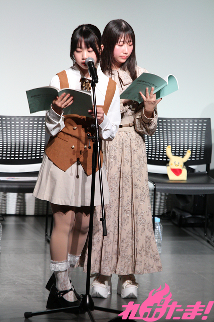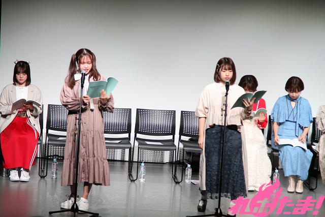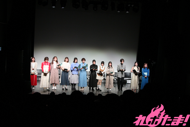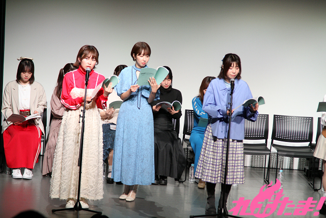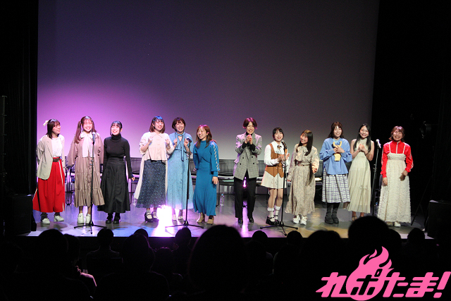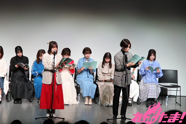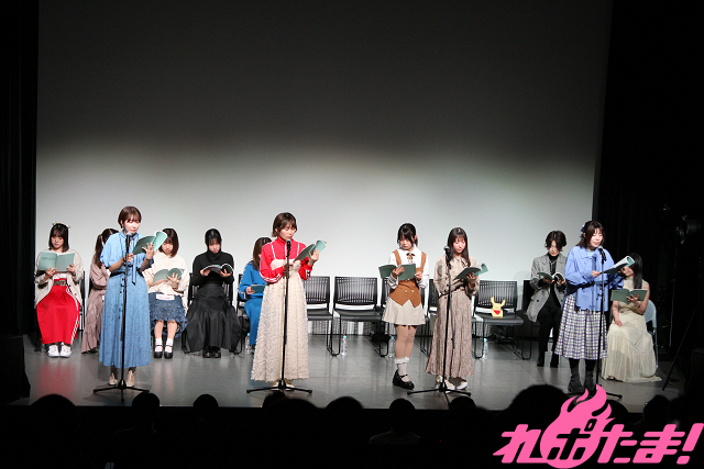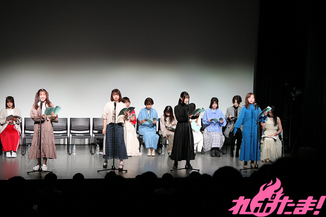 当日は池田海咲(舎川あこ役)、藤崎桃子(田野ながれ役)、新田ほのか(橋舟一花役)、眞塩藍咲(安浦千代役)、冷水優果(鎌谷しの役)、月野もあ(テガちゃん役)、岡田めい(マヌー役)、木下友里(ウサキちゃん役)、篠原 夢(舎川羽乃役)、谷 始央理(柱谷キリ役)、大熊里彩(野路辺くぬぎ役)、能登有沙(浜城実都役)が登壇。月野さんが司会のもと、トークや朗読劇で盛り上がった。
