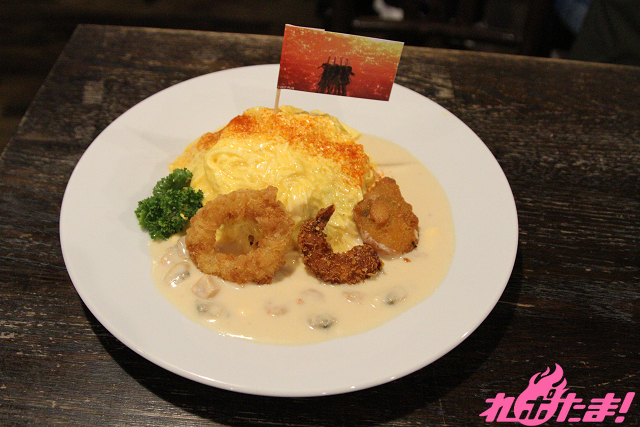 アニメで印象的な夕日のシーンをイメージしたオムライスとシーフードフライのプレート。