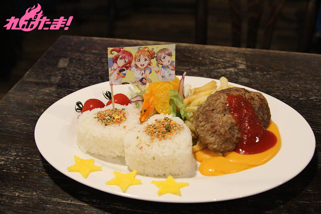 千歌の好きなみかんをサラダに、曜の好きなハンバーグ、ルビィの好きなフライドポテトを1皿に。