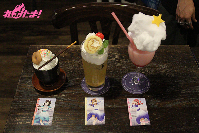 ▲左から「黒澤ダイヤの和風でパーフェクトな抹茶ミルク」「国木田花丸のはなまるロールケーキでおなかいっぱいりんごジュース」「黒澤ルビィのキラリふわふわドキドキいちごミルク」
