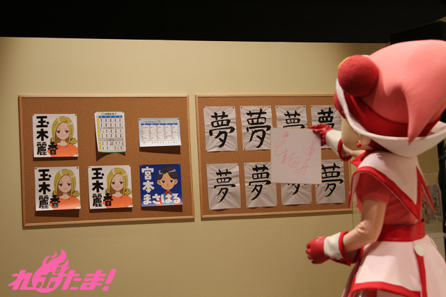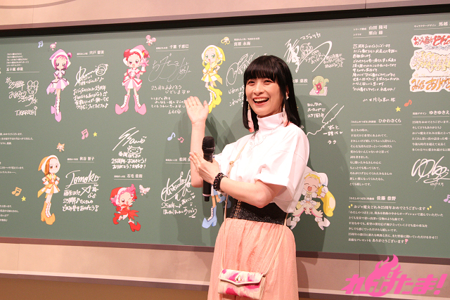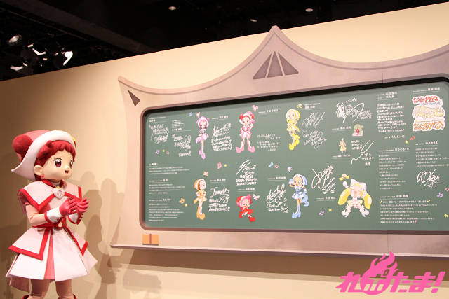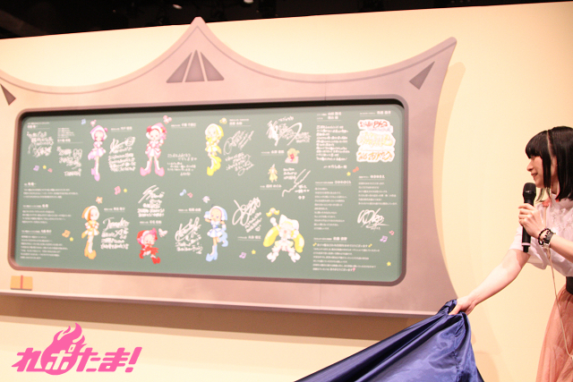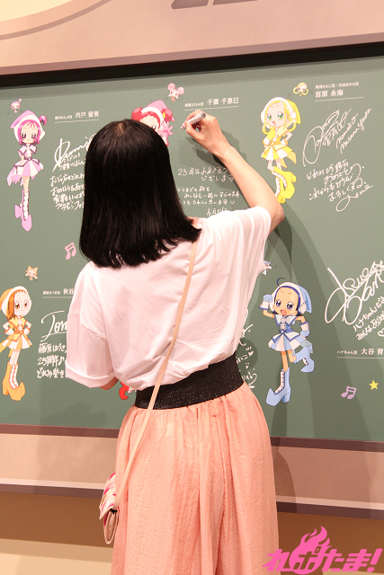 最後は千葉さんとどれみちゃんによる、キャスト・スタッフからのメッセージが描かれている黒板の除幕式。自身のメッセージが書かれた場所にサインを入れながら「最近はホワイトボードを使っている学校も多いので、とても貴重ですよね」としみじみ語る千葉さん。さらに、どれみちゃんが「私も!」とばかりにサイン色紙を披露。会場に展示されることが決まったのだった。