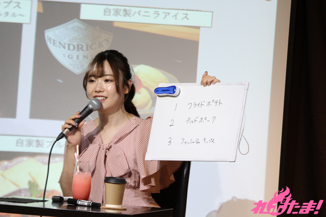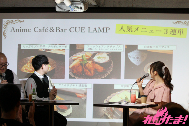 続いては「Anime Cafe&Bar CUE LAMP」とのコラボコーナー。「CUE LAMP」の東野店長が登場し、コラボメニュー(フード「リボン・アラビアータ」1,540円(税込)/ドリンク「Ribbon Truth」1,100円(税込))をはじめとしたおススメメニューの紹介を行なった。