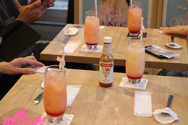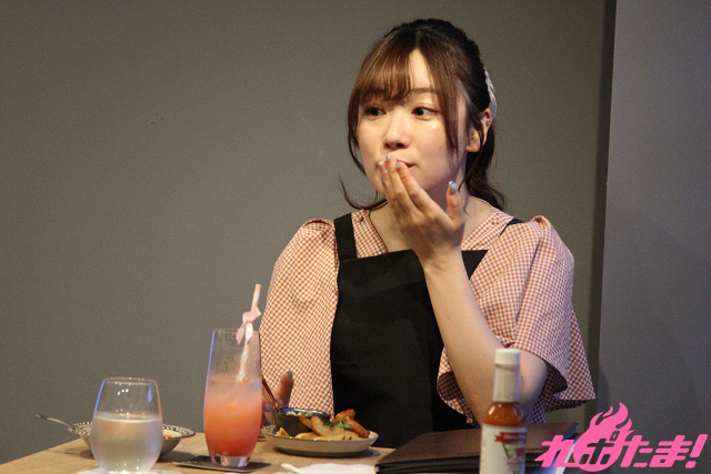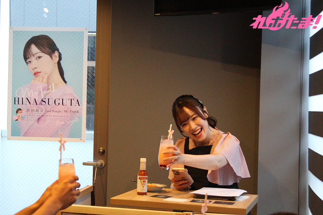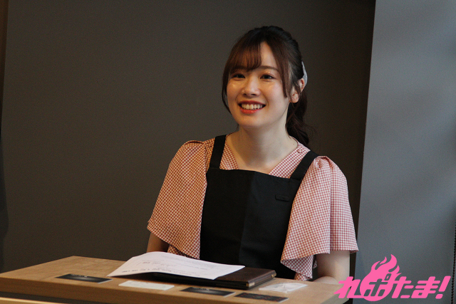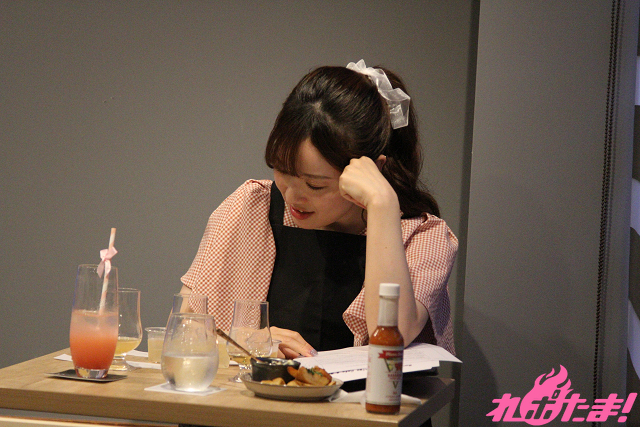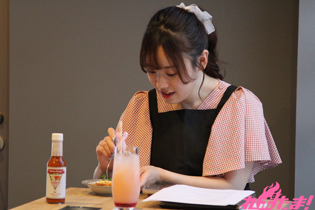 「『リボン・アラビアータ』は辛い物好きの私にとって最高です! しかも口臭が気になる仕事柄、普段はあまり食べることができないニンニクが効いているのもいいですよね!」、「『Ribbon Truth』は新曲からタイトルを付けていただいてありがたいです。かき混ぜ棒で混ぜると、より濃い色になって写真映えするので、ぜひ!」とコラボメニューをアピールしつつ、舌鼓。
