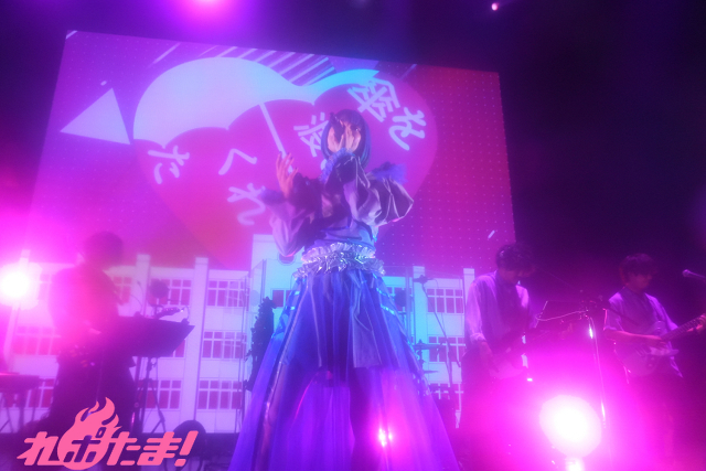 「今日は、さ、君と話してみたいことがあるんだけど」と語り始めたみあ。クラップが鳴り響くなか「たべてあげる」を披露すると「幸福なわがまま」をはねるように歌唱。さらに「あのね。」と続けていくと「僕らの幸福論」では時折目を閉じながら切なく歌い上げた。