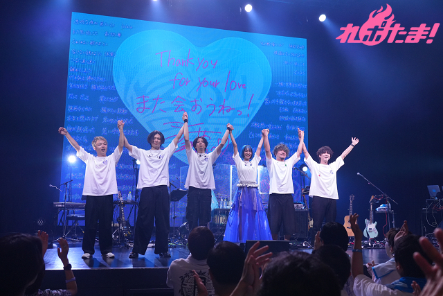 迎えたアンコールでは、ライブTシャツ姿の6人が登場。クラップに包まれて「シークレットハート」を久しぶりに披露すると、ステージを鮮やかに彩ってきたバンドメンバー(堀江晶太(ギター)、Saku(ギター)、Kei Nakamura(ベース)、裕木レオン(ドラム)、金井央希(キーボード)、古島知久(マニピュレーター)を紹介。