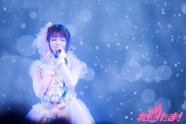 ライブは早くも後半戦。「ここからも心を込めて歌っていきます!」と、まずは「BLUE ROSE」を披露。さらに、客席が白いペンライトに埋め尽くされるという、季節を先取りしたような光景のなか「snowdrop」を歌い上げ、「Lightless」と切ない楽曲が続き、ラストスパートでは「Startear」「Overfly」とアニメ『ソードアート・オンライン』関連楽曲を立て続けに投下。場内は熱気に包まれた。