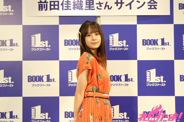 写真集でも拝むことができる、オレンジ色のワンピースで颯爽と登場した前田さん。大のお酒(とくに日本酒)好きでも知られ、今回も倉敷の地酒『多賀治』のほか、ロケ地滞在中(4日間)にたくさんの日本酒を堪能したそうだ。
